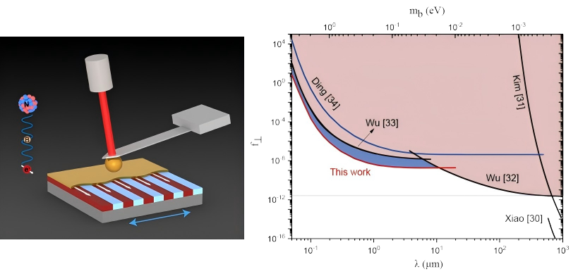 团队针对自旋-速度相关的新奇相互作用,采用末端粘接金球的微悬臂作为微弱力传感器,结合自主研发的光纤干涉仪,成功实现了飞牛顿量级的微弱力测量。通过独特设计的周期自旋调制结构和相位敏感的正交解调方法,实现对待测信号的空间调制与速度调制,从而攻克了将目标信号从背景干扰中高效分离的难题,有效提高了实验的探测精度。相比团队2020年取得的成果[Constraints on the Velocity and Spin Dependent Exotic Interaction at the Micrometer Range,Phys. Rev. Lett. 124, 161801(2020)],本研究在新型高稳定原子力显微镜、高电子自旋数调制结构、信号解调等关键技术方面取得突破。最终,在2.1微米作用程处,将测量精度较团队2020年水平提升约48倍,将之前国际最好水平提升约一个量级,在0.05-10微米作用程内,给出了对该相互作用迄今最强的实验限制。