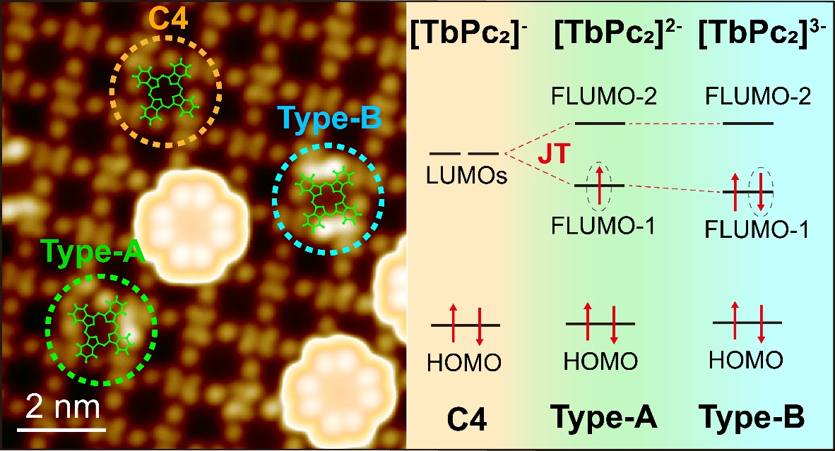 通过密度泛函理论(DFT)计算,团队解开了二重对称的成因:电荷诱导的Jahn-Teller畸变。对于C4-TbPc₂([TbPc₂]⁻),其最低未占据分子轨道(LUMO)是简并的(能量相同的两个轨道)。当分子捕获额外电子成为[TbPc₂]²⁻(A型)时,简并LUMO因Jahn-Teller效应分裂为两个能量不同的轨道(FLUMO-1和FLUMO-2),分子结构畸变为二重对称,以稳定多余电子。此时FLUMO-1轨道单电子占据,产生自旋,形成近藤共振。若再捕获一个电子成为[TbPc₂]³⁻(B型),FLUMO-1和-2轨道双电子占据,自旋配对,近藤共振消失,但二重对称性被保留。