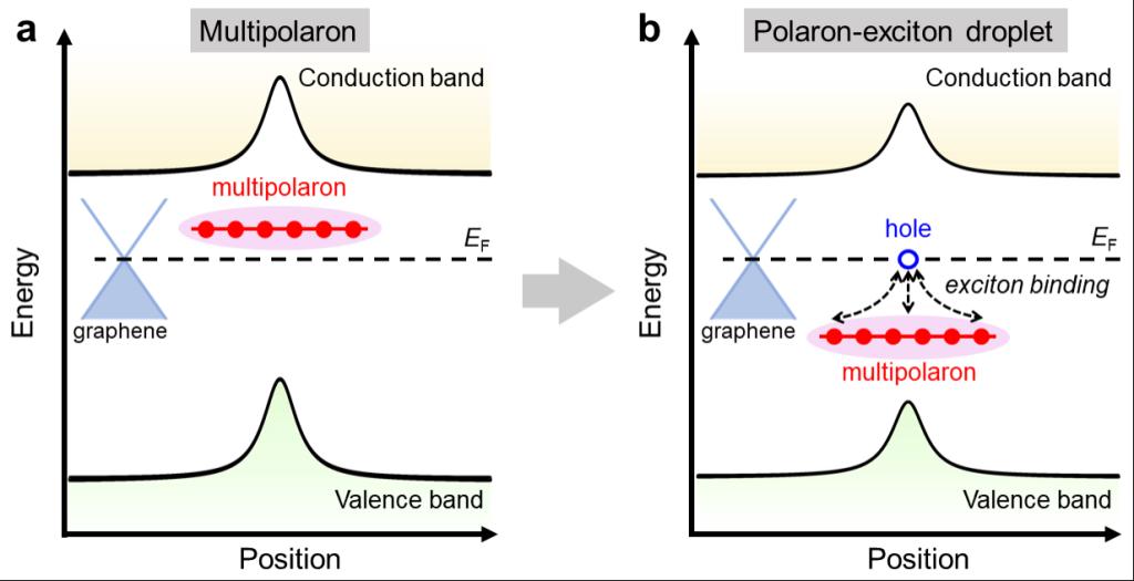 同时,团队提出“极化子-激子液滴” 的物理模型,用以阐释多极化子表观电荷减少的量子化行为(图3):费米能级处带正电的空穴会被带负电的多极化子捕获,形成由多个自陷电子与半金属石墨衬底提供的少量空穴相互束缚构成的极化子-激子液滴。这种液滴结构可部分抵消多极化子的负电荷,进而导致其表观电荷减少。