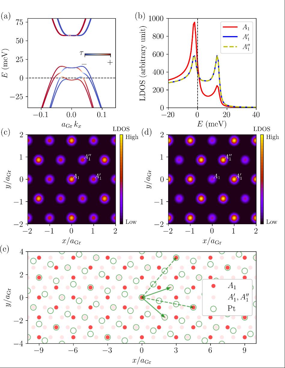 基于上述实验结果,团队理论合作者通过第一性原理能带结构计算发现Bernal 双层石墨烯的电荷中性点处于 PtSe₂半导体的带隙内。PtSe₂层会打破空间反演对称性,在界面处产生面外电场,这一电场能在Bernal 双层石墨烯的 ±K 谷电荷中性点处打开能隙,产生范霍夫奇点,进而提高态密度;此外,还会在 Bernal 双层石墨烯的价带态中诱导出伊辛自旋轨道耦合。理论上进一步对施加有效电场和空穴掺杂的Bernal 双层石墨烯进行自洽哈特里 - 福克计算,得到了具有时间反演不变性的谷间相干态。这种态会使 ±K 谷发生杂化,在石墨烯原子晶格上形成√3×√3 的周期性结构,且费米能级处的上下能峰呈现出相反的实空间分布图案。同时,PtSe₂与Bernal 双层石墨烯之间的高阶莫尔超晶格,能够放大石墨烯原子晶格上的 R3 调制效应(图2)。
