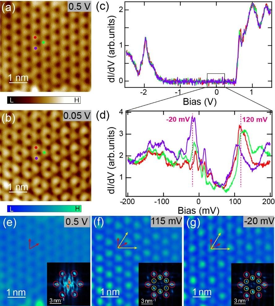 付英双团队利用扫描隧道显微镜,对石墨衬底上由单层二硒化铂(PtSe₂)与Bernal 双层石墨烯构成的异质结进行了观测,发现一种√3×√3 的调制图案。该图案叠加于异质结构的高阶莫尔超晶格之上,且与费米能级附近的能隙打开特征相关;同时,在两个能隙边缘呈现出反相的实空间电导分布(图1)。这些结果证实了Bernal 双层石墨烯中谷间相干相的存在,并揭示高阶莫尔效应可对该物相产生放大作用。在双层石墨烯覆盖的碳化硅衬底上的单层二硒化铂异质结构中,由于双层石墨烯的载流子浓度升高,上述调制图案及伴随的小能隙均消失。这一现象表明,合适的载流子浓度与强关联效应是谷间相干相形成的必要条件。