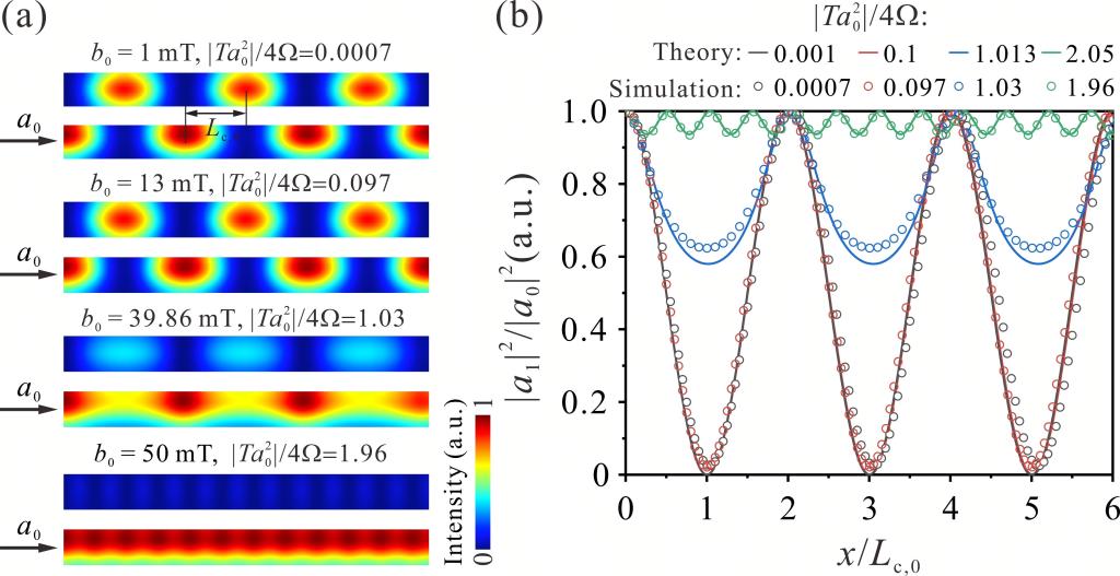 该课题组研究发现,如图1(a)所示,在垂直磁化的面外耦合波导中,在小功率激发下(b0 =1 mT),由于磁偶相互作用,相邻波导间磁子能量交替传递,这与面内耦合波导类似。而随着激励功率增大并超越阈值,自旋波呈现出大角度进动(约22.5°),相邻波导出现解耦合,当激励磁场为b0=50 mT时,磁子能量完全局域在激发波导中[图1(a)]。通过建立相邻波导自旋波幅度的耦合方程,求解了自旋波能量的空间分布与激发功率的关系,该理论结果与微磁学模拟具有一致性[图1(b)]。这种非线性解耦合行为来源于自旋波色散曲线的频移,当波导内自旋波大角度进动时,色散曲线的频率量大于相邻波导的耦合强度W的四倍,相邻波导间的能量传递逐渐减小并直至解耦合。色散曲线上表现为从两种模式磁子演变为单一模式磁子。