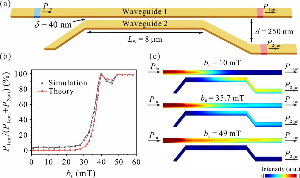 图2 深非线性磁子定向耦合器的切换功能。(a)磁子定向耦合器示意图:波导宽度w=100 nm,厚度t=50 nm,间隙d=40 nm,波导耦合长度LW= 8 μm,波导间最大边缘间距d= 250 nm;(b) 波导1自旋波的归一化输出功率的模拟值(黑线)与理论值(红线)随激励磁场b0变化关系;(c) 三种特定激励场下的归一化自旋波强度分布:b0= 10 mT、35.7 mT和49 mT,对应的归一化输出功率值分别为3.6%、50.3%和98.7%。