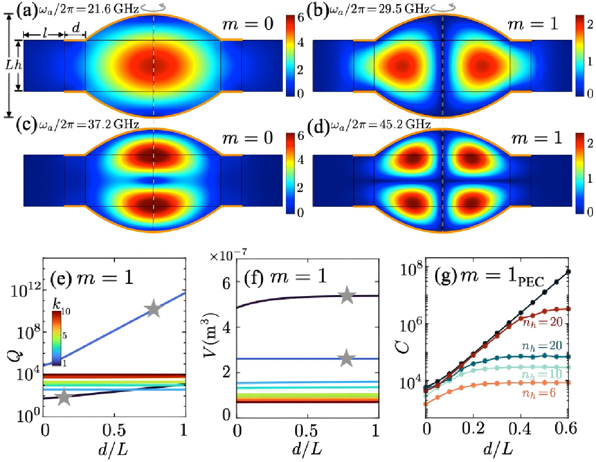 图. (a-d)不同共振模式的电场强度分布; (e-g)品质音子、模式体积、单原子协同参数。