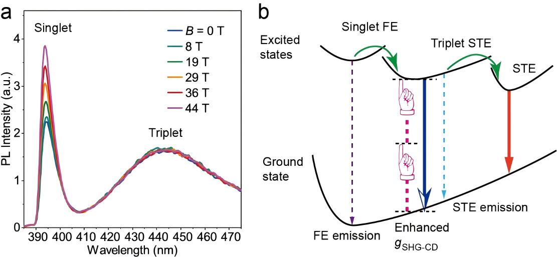 通过温度(5-300K)和磁场(0-44T)依赖的光致发光光谱研究,揭示了此波段自陷激子的存在,且其激子发光的光子能量与gSHG-CD值极大值对应的光子能量位置存在共振增强关系。值得注意的是,低温下的带边激子发光随磁场强度增加而增强,显示出自旋单态的暗激子特征,而共振波长处的自陷激子发光强度几乎不随磁场变化,展现出自旋三重态的亮激子特征(图2a)。因此,这些研究结果说明自旋三重态激子有利于增强SHG-CD效应(图2b)。该发现本项研究工作得到了国家自然科学基金和国家重点研发计划等项目资助。