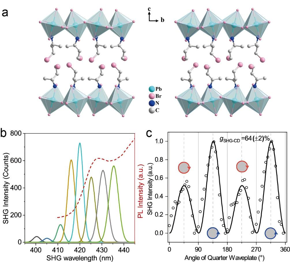 该课题组研究了具有光学手性结构的(R/S-BrsBA)₂PbBr₄(BrsBA为4-溴-2-丁基铵)单晶(图1a)。利用自主搭建的偏振调控SHG测量系统,发现这种类型单晶因为其结构手性引发的波长依赖的高偏振SHG信号(图1b);在圆偏振入射光下,该晶体的SHG强度展现出随入射光圆偏振度的高灵敏响应,且gSHG-CD值在带边以下展现出异常的增强现象,最高达0.64(图1c)。