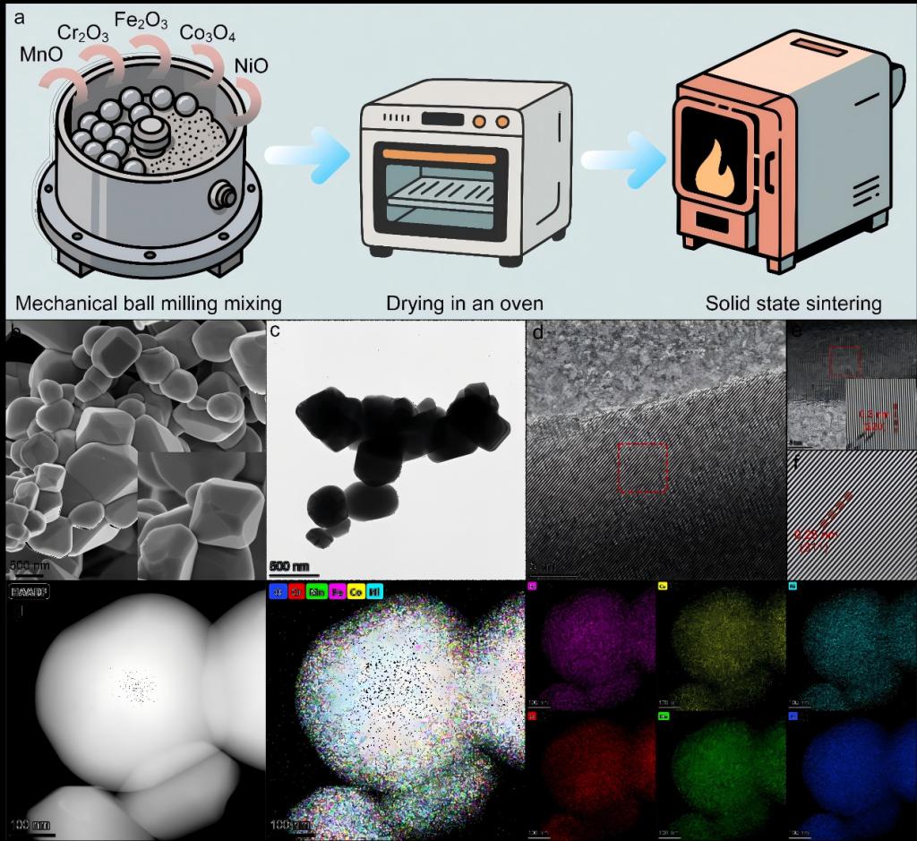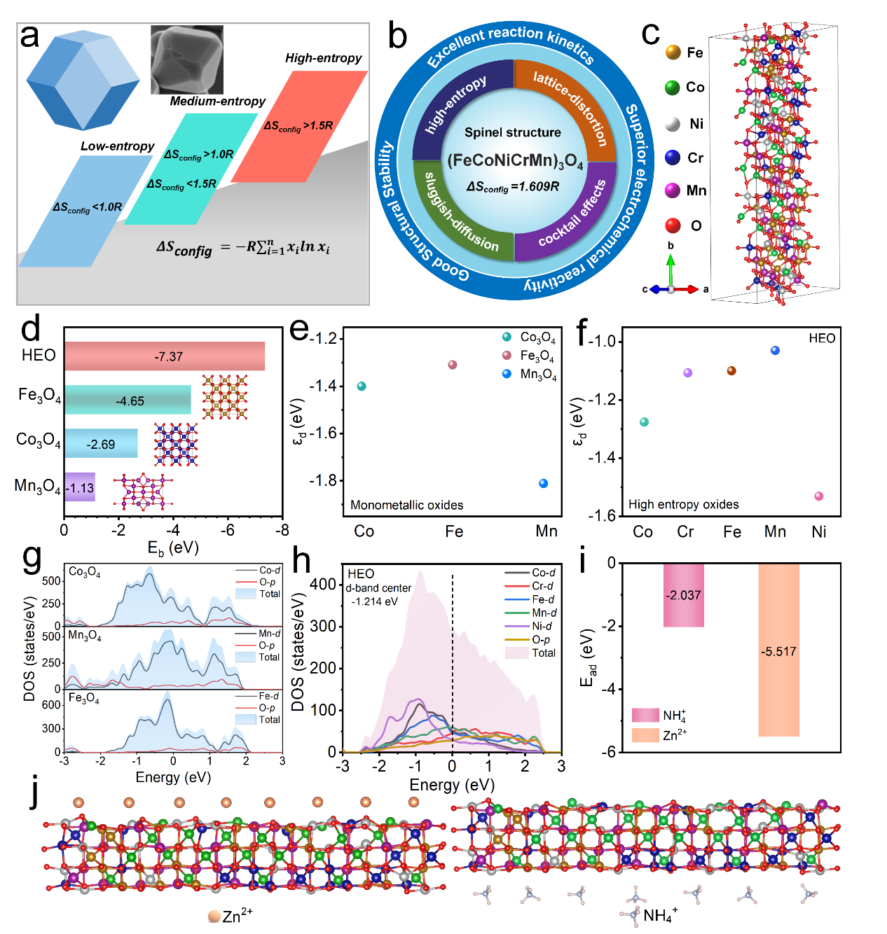 该团队基于物理学的重要概念−熵,设计并制备出一种高熵材料−五元高熵尖晶石氧化物(FeCoNiCrMn)₃O₄(HEO),利用其独特的多组分协同效应和结构稳定性,构建了一种兼具刚性晶体框架和丰富表面活性位点的多功能电极,为协调Zn²+与NH₄+的存储机制提供了新思路,为解决水性储能装置中电极材料难以同时满足高容量与高功率需求的难题提供了创新性解决方案,有望突破现有水性储能技术的瓶颈。