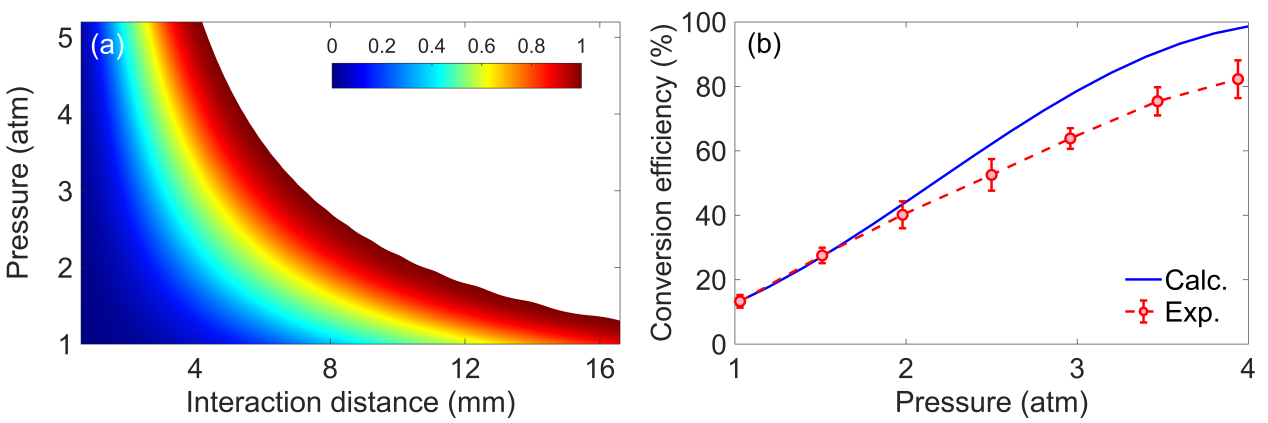 针对这一问题,兰鹏飞、何立新课题组提出一种全新的产生超短涡旋脉冲的方法—分子波片(Molecular wave plate)。该方案主要基于矢量光诱导的分子非绝热排列效应,使分子极化率在空间上呈现特定的各向异性分布,从而形成一个可编程的分子波片。 当圆偏振探测光通过该分子波片时,会发生空间相位调制,生成具有相反手性和特定拓扑荷数的涡旋光束(如图1)。此外理论模拟与实验结果表明,通过优化气体密度及激光与气体相互作用长度,涡旋光转换效率可接近100%(如图2)。与传统光学元件相比,分子波片具有超宽带适应性,能够有效克服色散和色差问题。同时,由于采用气相分子介质,其具备高损伤阈值和自修复特性,从根本上避免了固体器件易受损伤的局限。这一突破为产生高强度、超短涡旋脉冲提供了全新的解决途径。