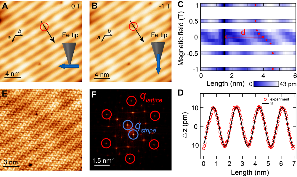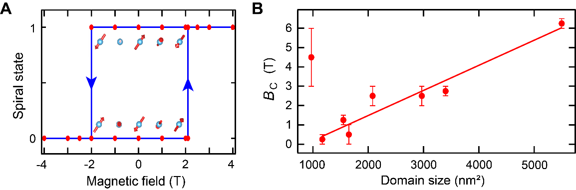 此外,团队通过反铁磁的Cr针尖进一步验证了螺旋磁序的稳定性,并发现当磁场超过一定值时,自旋条纹图案突然反转,形成磁滞回线,且翻转场的大小与样品的面积呈线性关系(图3A,B)。这是由于有限磁畴内非整数倍螺旋周期可以产生净磁矩,从而可在磁场下产生集体自旋翻转。