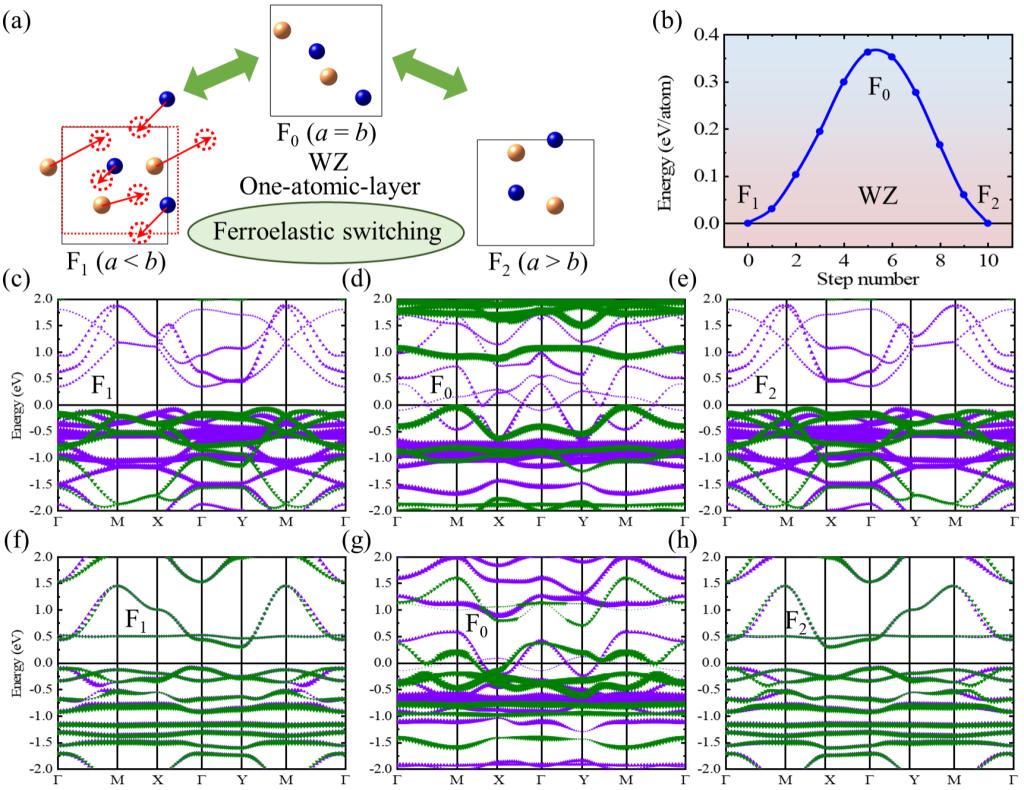 图1:WZ相单层CrSb(110)面的(a)铁电翻转和(b)势垒,(c-e)铁磁和(f-h)反铁磁构型下自旋分辨Cr贡献的能带。