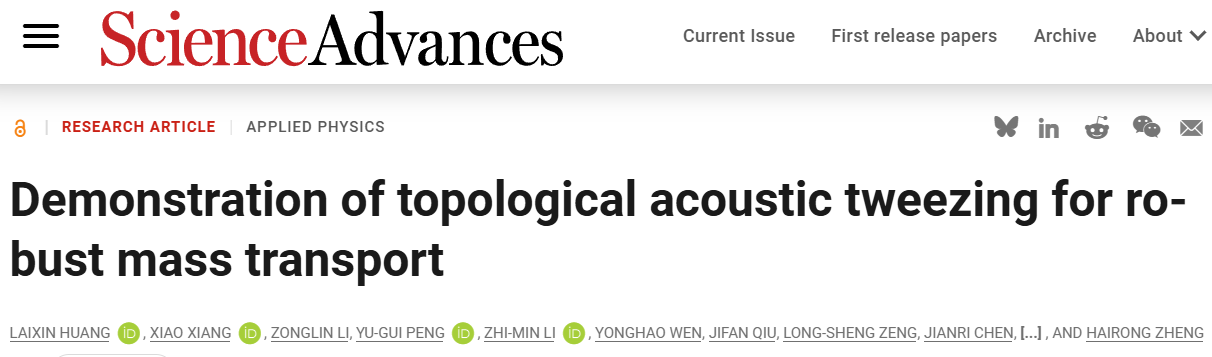 声镊技术凭借其非接触式操控优势,已在细胞、生物分子等微纳米尺度颗粒操控领域获得广泛应用。然而,传统声镊在复杂非均匀介质(如生物组织、复杂流体)中面临着根本性挑战:声波穿过不同密度、声速的介质时会发生散射、反射、折射和畸变,导致声场紊乱,造成操控失效,成为非均匀复杂介质中实现精准操控的主要障碍。1月1日,祝雪丰教授联合中国科学院深圳先进技术研究院郑海荣院士、李飞研究员提出了一种在复杂强散射介质中实现精准、动态、稳定声操控的突破性解决方案。相关研究成果以“Demonstration of topological acoustic tweezing for robust mass transport”为题发表在《Science Advances》上。深圳先进技术研究院郑海荣院士和李飞研究员和祝雪丰教授为论文共同通讯作者;深圳先进技术研究院助理研究员黄来鑫、华中科技大学博士研究生向霄(已毕业)与李宗霖(已毕业)为并列第一作者。