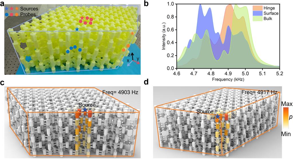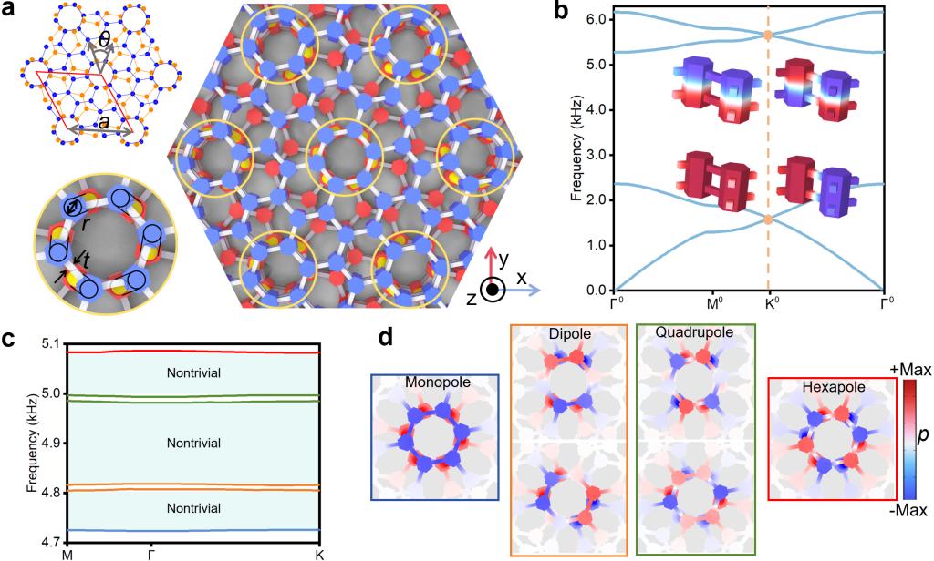研究以21.78°扭转角的声学石墨烯双层结构为平台,通过在特定位置引入层间耦合以形成竞争性相互作用,成功获得了具有驻波特性的全平带结构。定量分析表明,强层间耦合是促成平带形成与拓扑相变的关键因素。该声学扭转莫尔超晶格展现出六个平带及三个拓扑非平凡的带隙,其本征模式涵盖了从单极子到六极子的完整米氏共振。实验上通过三维打印样品验证了体态、边态、角态以及三维铰链态的存在,与仿真结果高度一致。该工作不仅为构建声学全平带拓扑系统提供了一条简洁有效的路径,深化了对扭转莫尔超晶格物理的理解,而且所展示的频率选择传输、高Q谐振及多维拓扑态控制特性,在声能收集、传感、波束分离及滤波等领域具有潜在的应用前景。