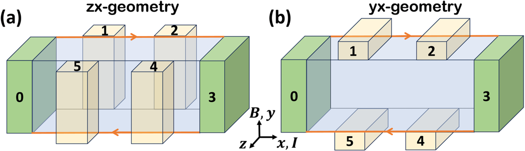 图1(a)竖直磁场下量子霍尔效应的经典输运测量构型;(b)通常被认为平庸的面内输运测量构型。