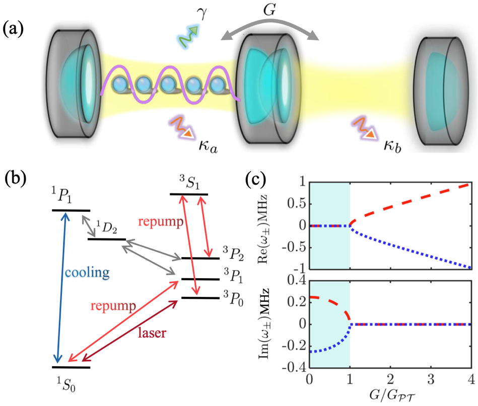 原子钟是当前最精密的测量装置之一,在引力波探测、暗物质探索、相对论检验、信息网络以及卫星导航等领域具有广泛应用。原子钟的线宽是决定其频率稳定性和测量精度的关键参数。基于超辐射激光的光学原子钟能够实现窄线宽输出,从而显著提升原子钟稳定性。然而,超辐射激光的线宽受Purcell增强的原子自发辐射速率所限制,因此进一步压缩线宽既具有挑战性,也具有重要意义。奇异点(Exceptional Points, EPs)是非厄米宇称-时间(PT)对称系统中的奇异结构,具有一系列独特性质,可引发损耗诱导相干、手性模态切换以及显著的灵敏度增强等新奇物理现象。PT对称性与超辐射激光结合,作为超辐射激光发展中的一个重要方向,有望突破上述限制,实现线宽的进一步压缩。