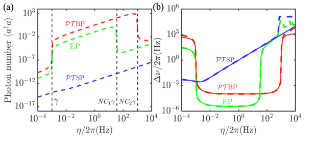 图2:PT对称性守恒、破缺和EP点处的光子数和输出线宽。