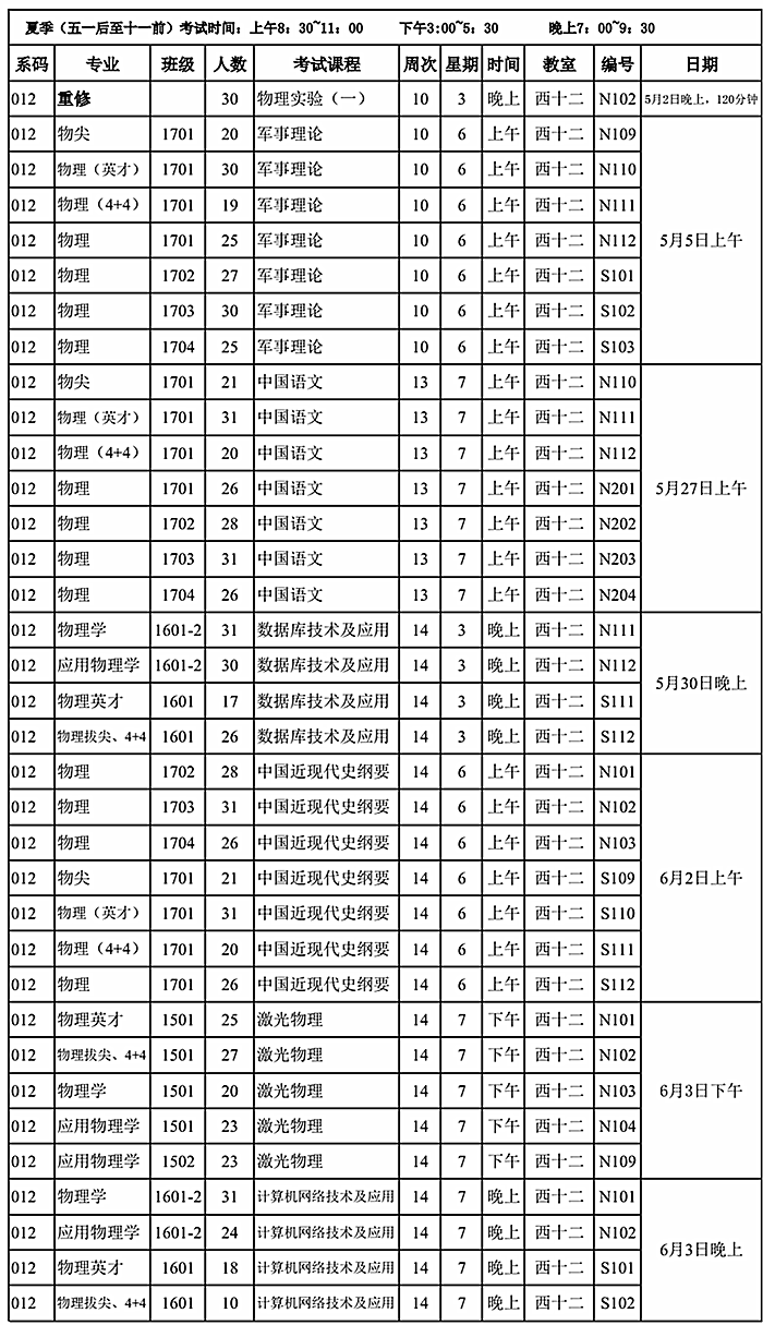 物理学院2017~2018学年第二学期考试安排(10-14周)