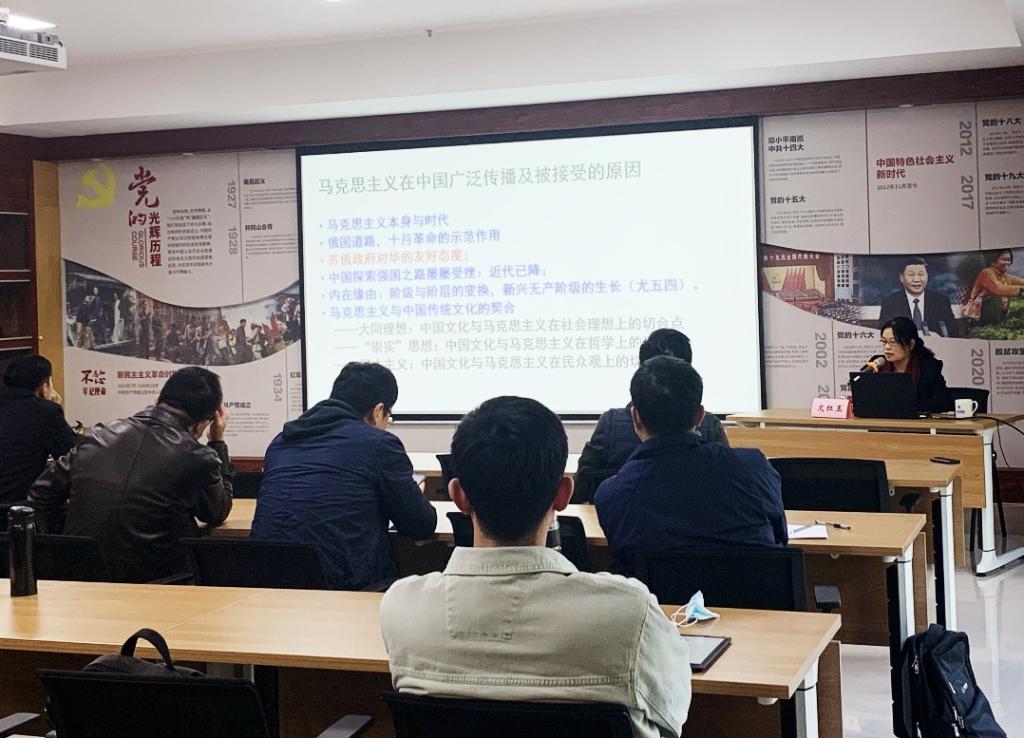 文红玉教授以《中国共产党为什么能?——学习贯彻习近平总书记“七一”重要讲话精神》为题,围绕着中国共产党的奋斗历程、主要成就和典型特质,深刻阐述我党百年征程和七十余载执政的历史必然。文教授将习近平总书记“七一”重要讲话精神归纳总结为“一个主题”、“立足‘两个一百年’奋斗目标历史交汇节点”、“三个深刻改变”、“四个伟大成就”、“五个庄严宣告”、“九个必须坚持”六大内容。她指出,中国共产党既不是当今世界上唯一拥有百年历史的政党,也不是执政时间最长的政党,却是从小到大、从弱到强的政党典范。现如今我党事业已然呈现出数量之“巨”、基础之“巨”、能力之“巨”、业绩之“巨”、影响力之“巨”的态势。对比1949年前后的中国,不难发现中国共产党执政下的新中国国家统一、民族团结、社会稳定、经济繁荣、文化兴盛,所获成效,为世界史所仅见。文教授强调,我党在百年奋斗中积累了丰富的历史经验,拥有科学的理论基础、先进的制度保障、崇高的理念和坚强的决心,必将带领中国人民建成富强民主文明和谐美丽的社会主义现代化强国。