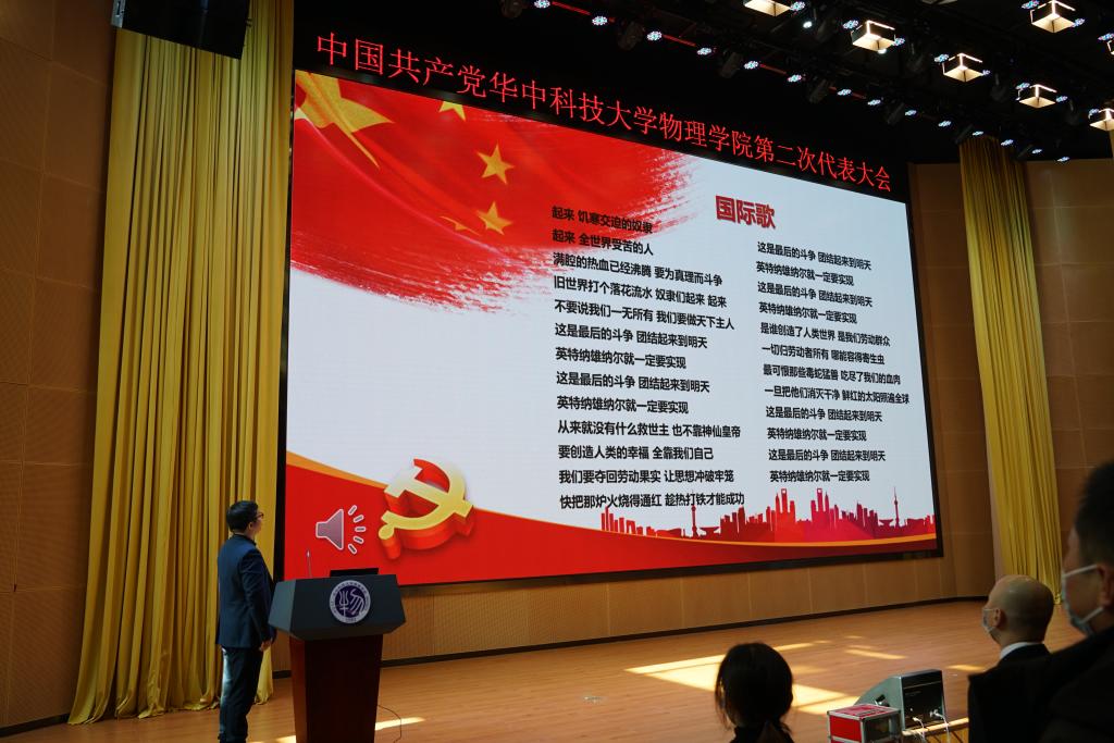 在雄壮的《国歌》声中,中国共产党华中科技大学物理学院第二次代表大会正式开幕。会议由党委副书记王兵同志主持。