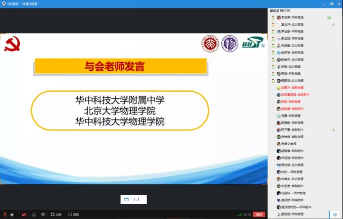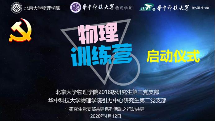4月12日上午9:00,华中科技大学物理学院引力中心研究生第二党支部和北京大学物理学院2018级研究生第三党支部“同心共建青春战疫”系列活动之行动共建——“物理训练营”在线上准点启动,此次活动主要是培养高中生在线上查阅并整理资料、思考并解决问题的能力。华中科技大学附属中学24名高一学生参加了此次“物理训练营”活动。除开两个支部的党员和附中的同学外,启动仪式还邀请了华中科技大学附属中学党委书记周志刚老师、华中科技大学物理学院党委书记张凯老师、华中科技大学物理学院教授吴庆文老师、北京大学物理学院团委书记张帆老师等参加。