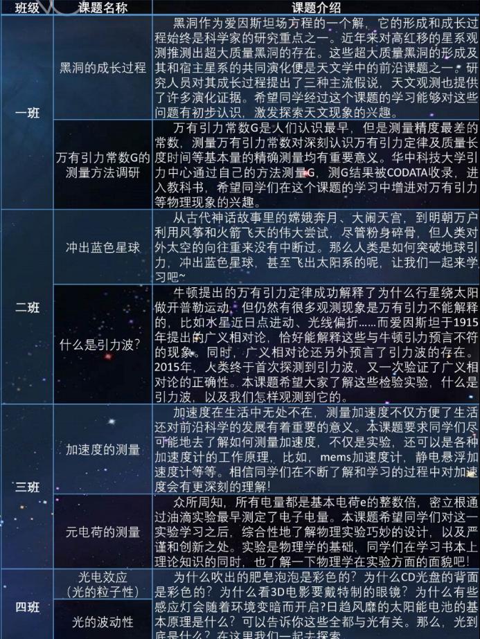 此次活动党员与学生一共分为4个班级,每班6名学生,12名党员,设立两位“班主任”。在后面为期近一个的活动中,每位班主任将给出各自领域中的一项小课题,由北大和华科两名研究生党员辅导一位高中生完成课题研究。在随后的活动中,8位班主任向同学们简要介绍了他们精心准备的课题。
