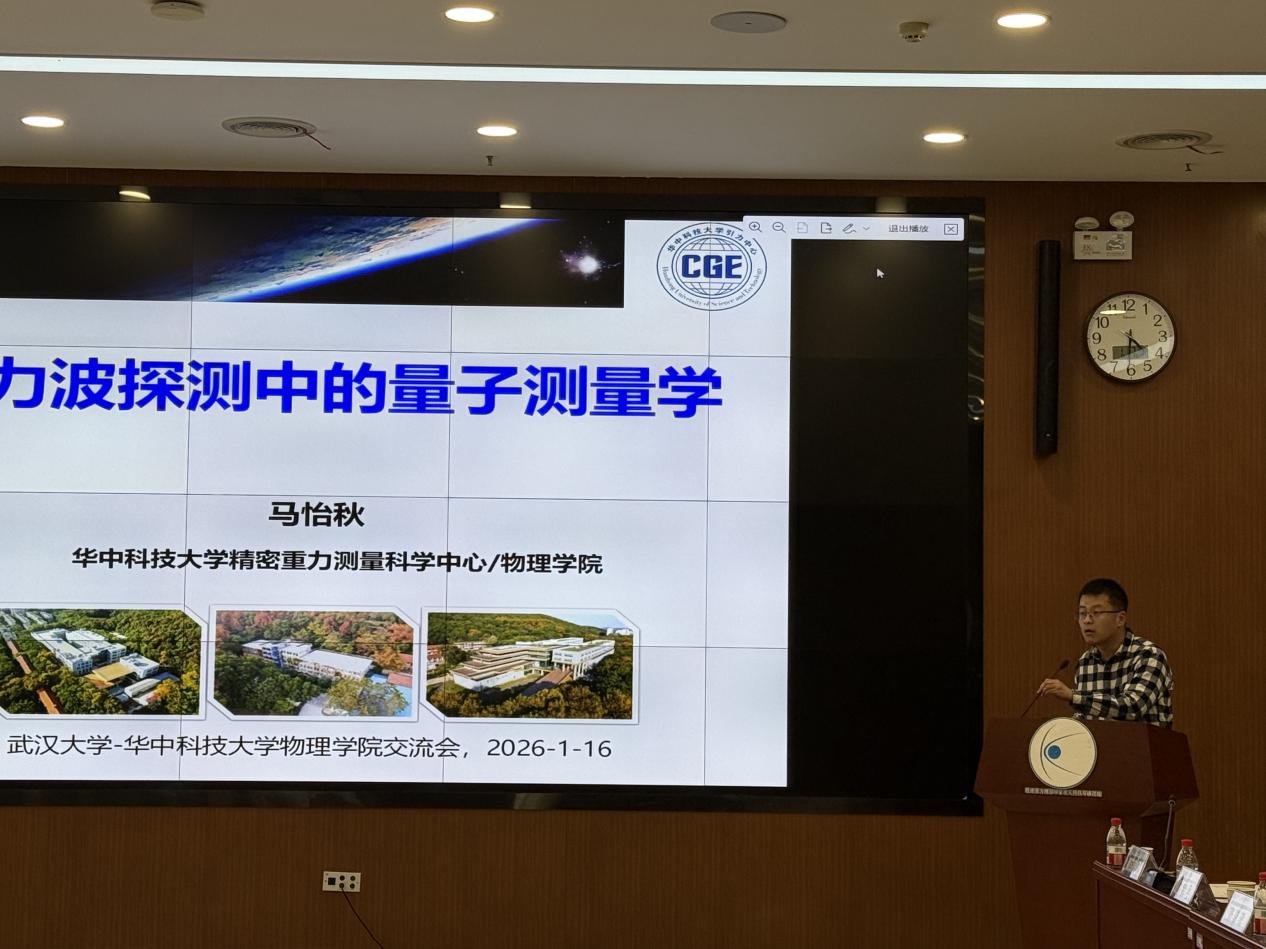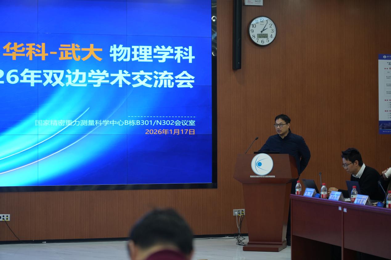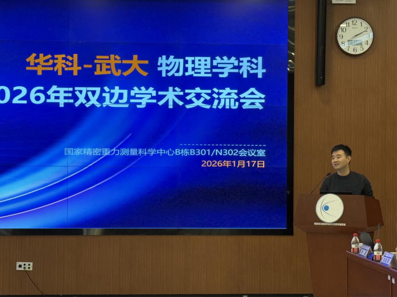 2026年1月17日,华中科技大学-武汉大学物理学科2026年双边学术交流会在国家精密重力测量科学中心顺利召开。本次会议以学术交流为核心,旨在促进两校学者沟通协作,推动相关领域合作,该活动吸引了来自两校物理学科的众多专家学者参与。