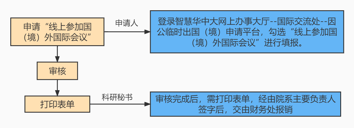 备注:需在线上参会前15天,登录智慧华中大网上办事大厅,完成填报工作 咨询:学院人事与外事科江可凡老师(科技楼北402,027-87543981)