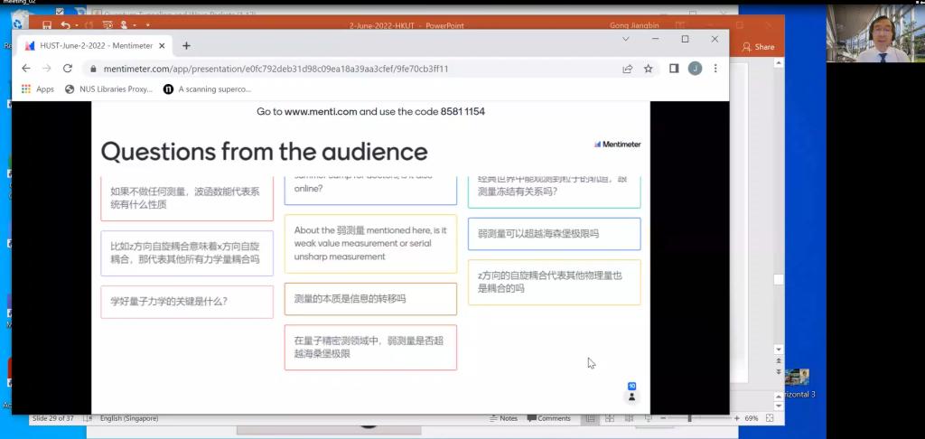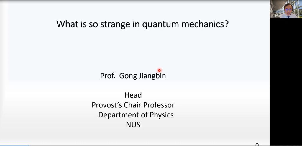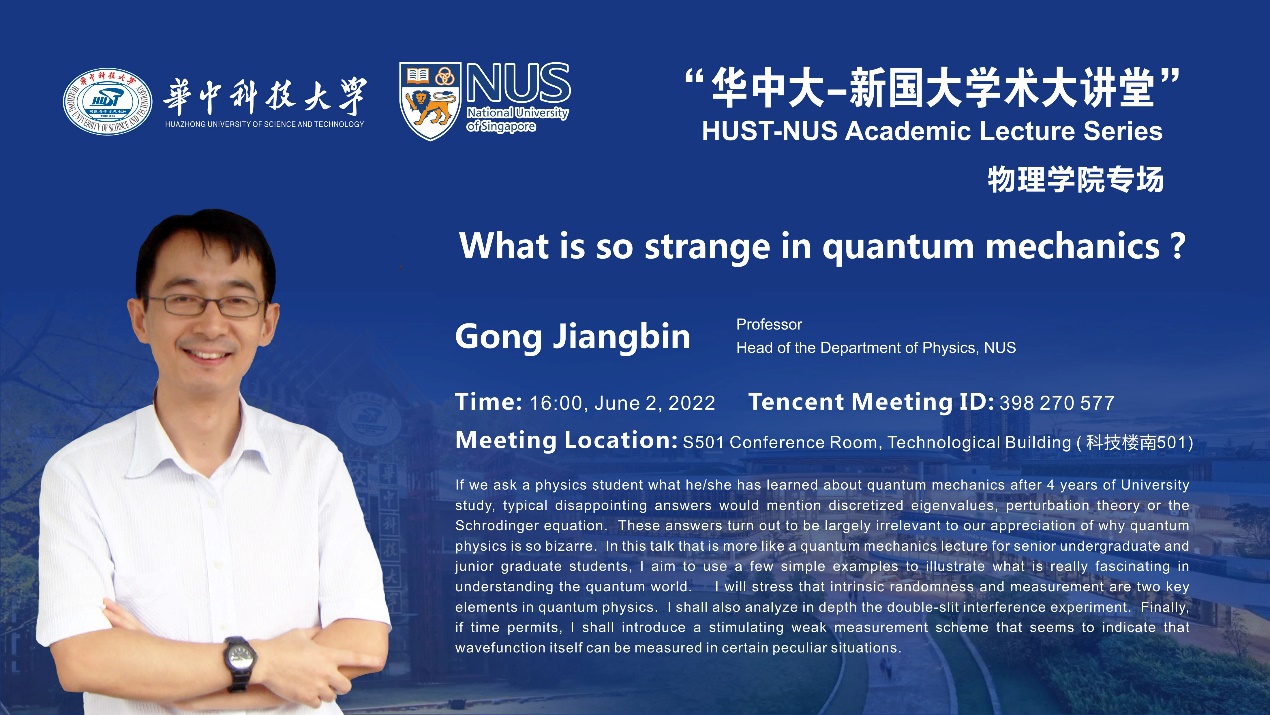 6月2日下午4点,“华中大-新国大学术大讲堂”系列讲座物理学院第二期活动顺利召开。应吕京涛教授邀请,新加坡国立大学物理系龚江滨教授为本科生作了题为“What is so strange in quantum mechanics ?”的专题讲座。国内外高校100余名科研工作者线上参会。