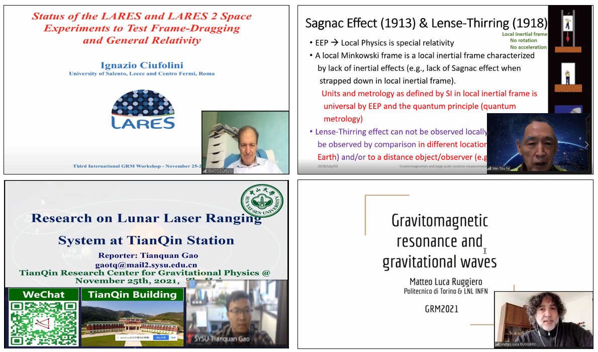 中国科学院精密测量科学与技术创新研究院倪维斗教授总结了近年来大型激光陀螺仪、Gravity Prob B计划、LAGEOS、LARES对引磁效应测量的进展;中山大学高添泉博士生、汉诺威莱布尼兹大学Liliane Biskupek博士、都灵理工大学Matteo Luca Ruggiero博士和意大利萨伦托大学Ignazio Ciufolini教授讨论了引磁效应以及月地、卫地测距相关项目的研究进展。