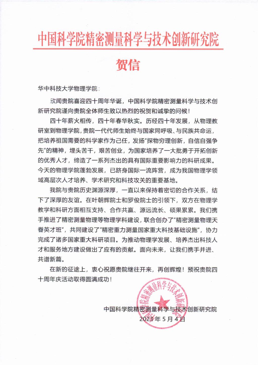 【兄弟院校贺信】中国科学院精密测量科学与技术创新研究院