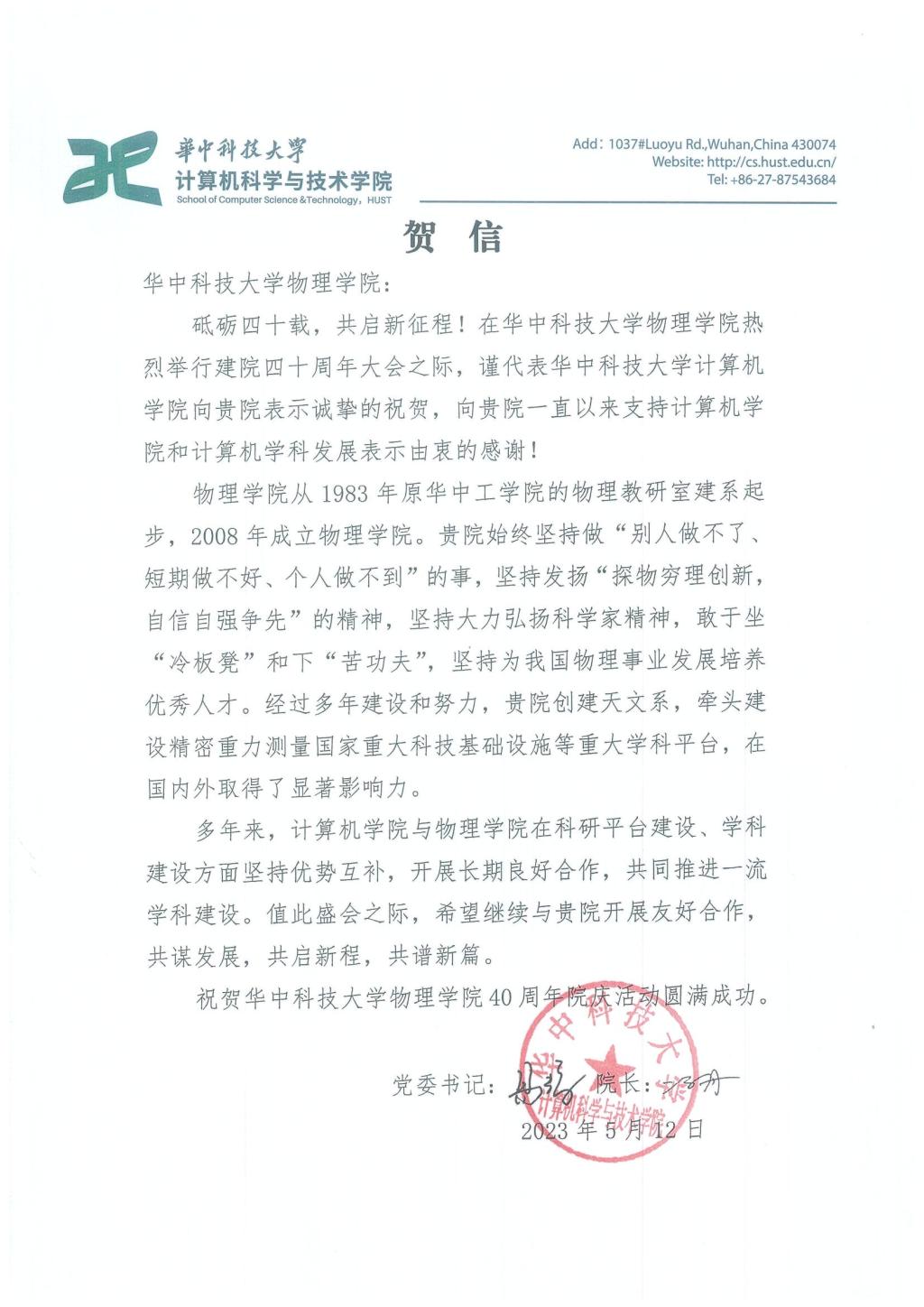 【兄弟院校贺信】华中科技大学计算机科学与技术学院