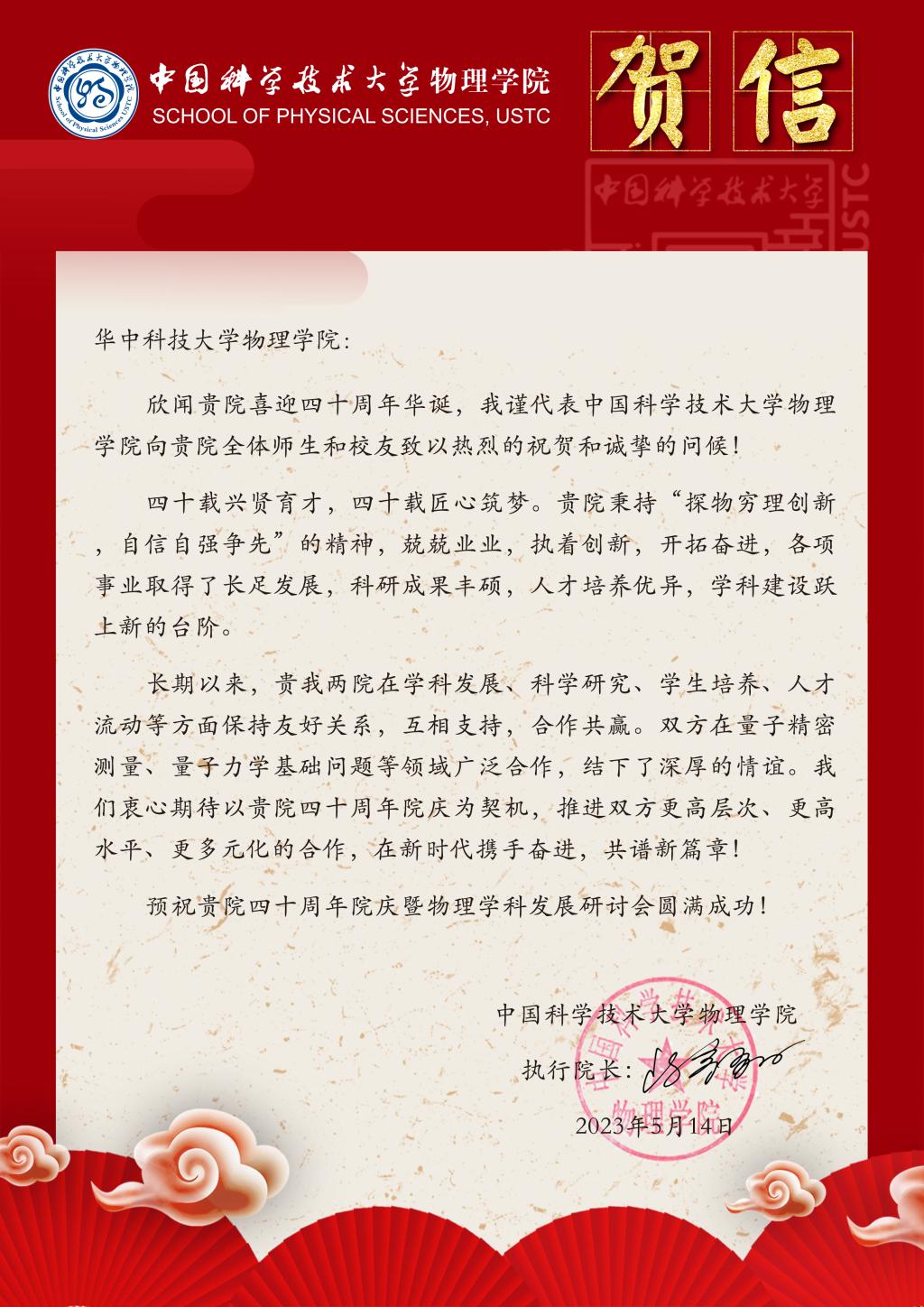 【兄弟院校贺信】中国科学技术大学物理学院