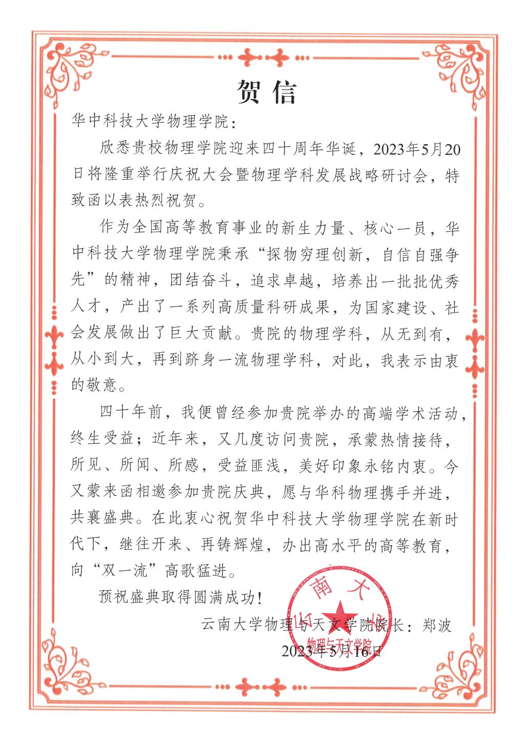 【兄弟院校贺信】云南大学物理与天文学院