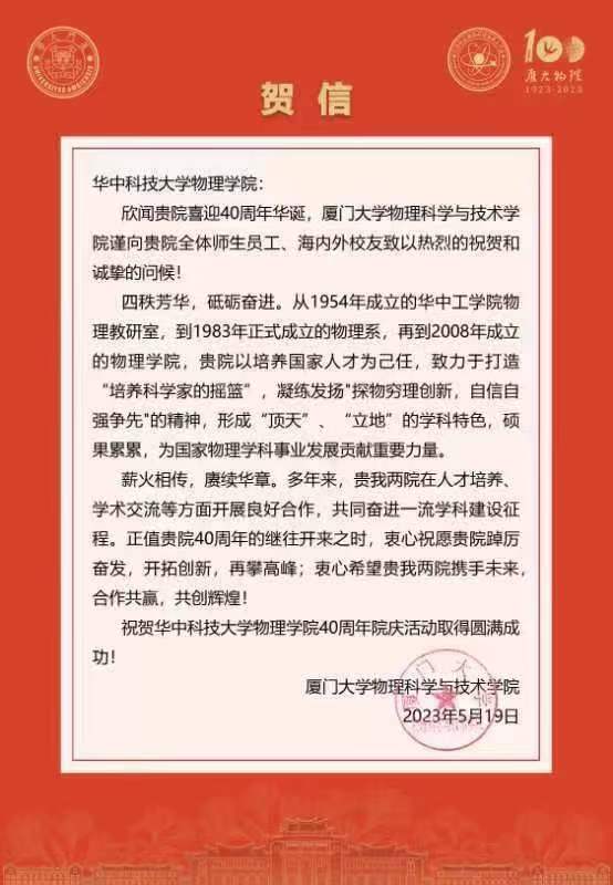 【兄弟院校贺信】厦门大学物理科学与技术学院