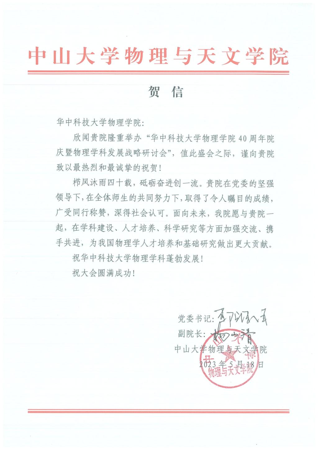 【兄弟院校贺信】中山大学物理与天文学院