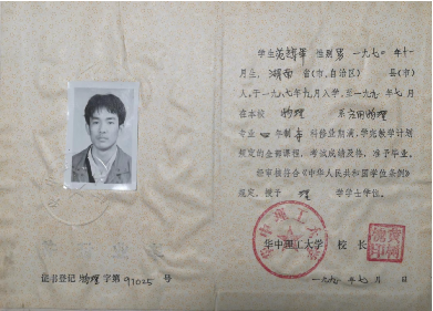 1985年,为培养杰出人才,包括华中工学院在内的12所高校获批开设少年班。华中工学院采取低年级在物理系培养,高年级分流到其他院系的培养方式,共招收了10届,培养了161名少年班大学生。范辉军老师于1987年从湖南省郴州市宜章县一中进入华中工学院,成为第三届物理系少年班学员,入学时年仅15岁。时至今日,他仍是宜章县一中走出的唯一少年班大学生。范老师回忆时感慨,这真是一次偶然的契机,令他敲开华工少年班之门。